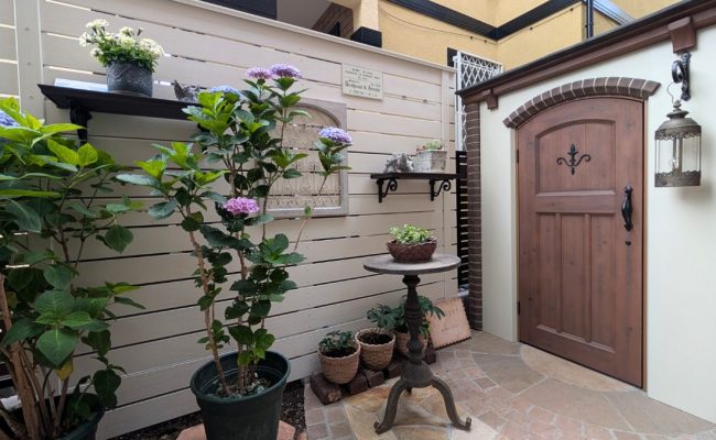 ガーデン・お庭・植栽、目隠しフェンス グリーンとアンティーク雑貨をお部屋から眺める