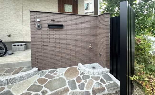 プラスGのフレームにダウンライトを入れ、夜のシーンも印象的なファサードです。門の内側には自転車4台を入れる予定とのことで、極力デッドスペースを作らないよう、立水栓の水受けもフラットなものをご提案いたしました。
