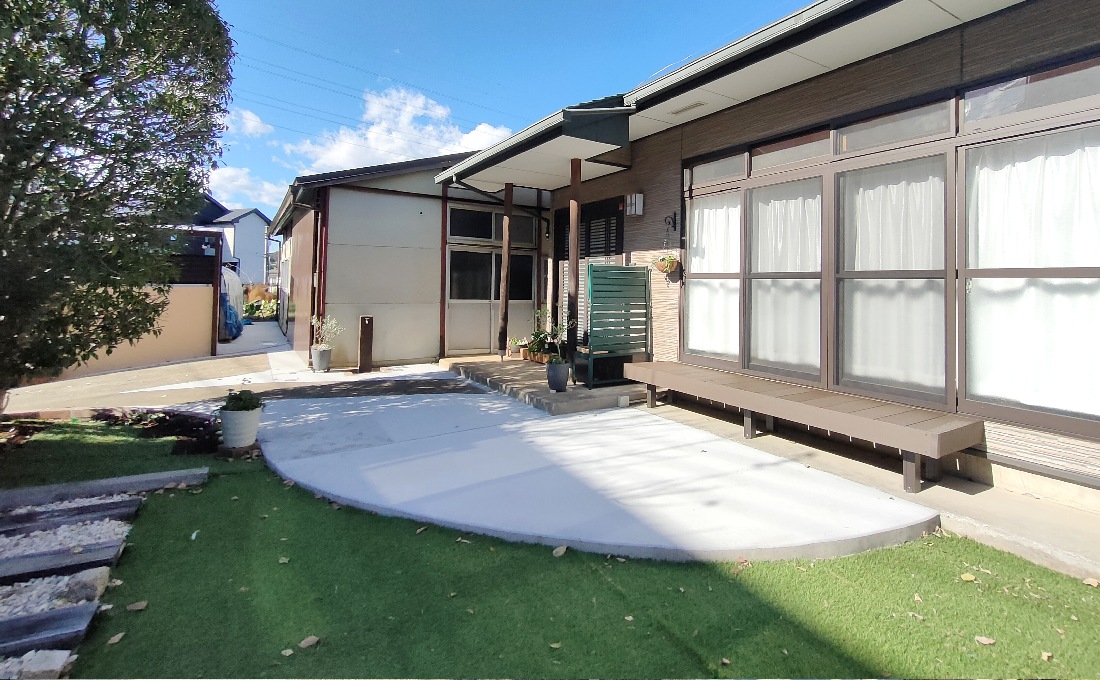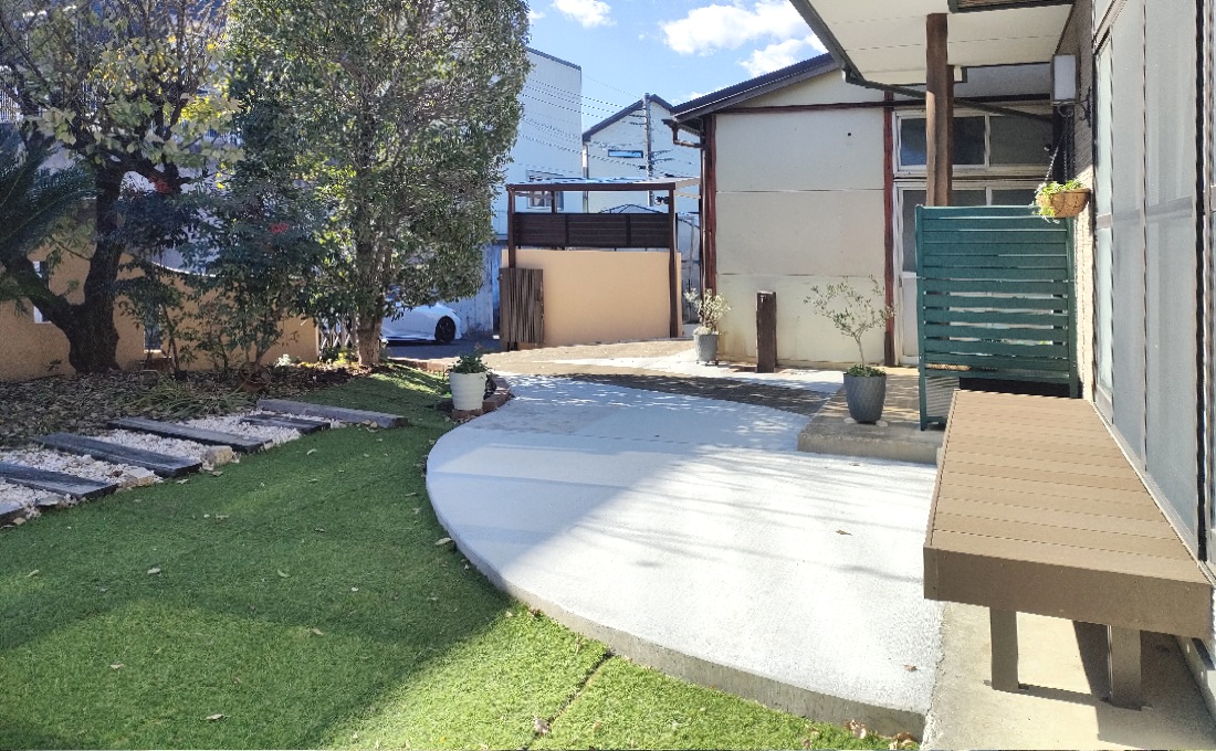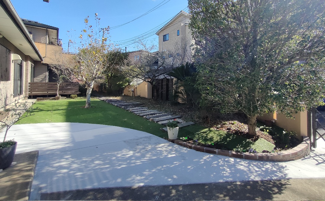 お庭は既存の人工芝を延長しきちんと区画。お手入れの手間をおさえられるよう土の面をなるべく減らしました。