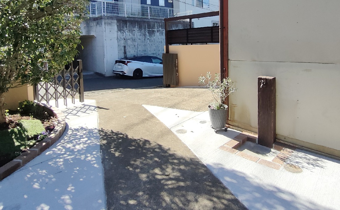 畑があるサブエントランスは土間を広げ、伸縮門扉でクローズできる駐車場に。
