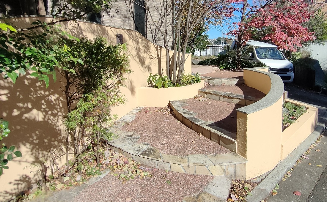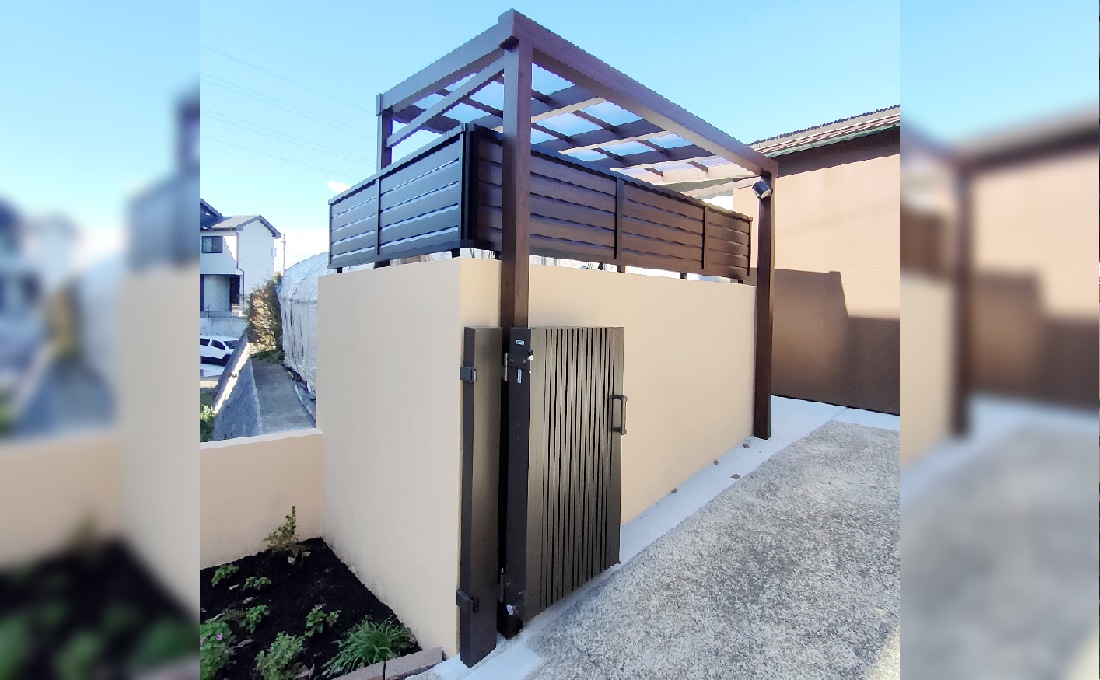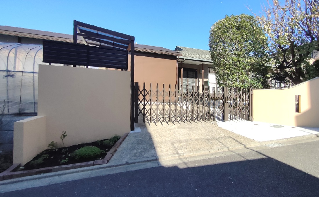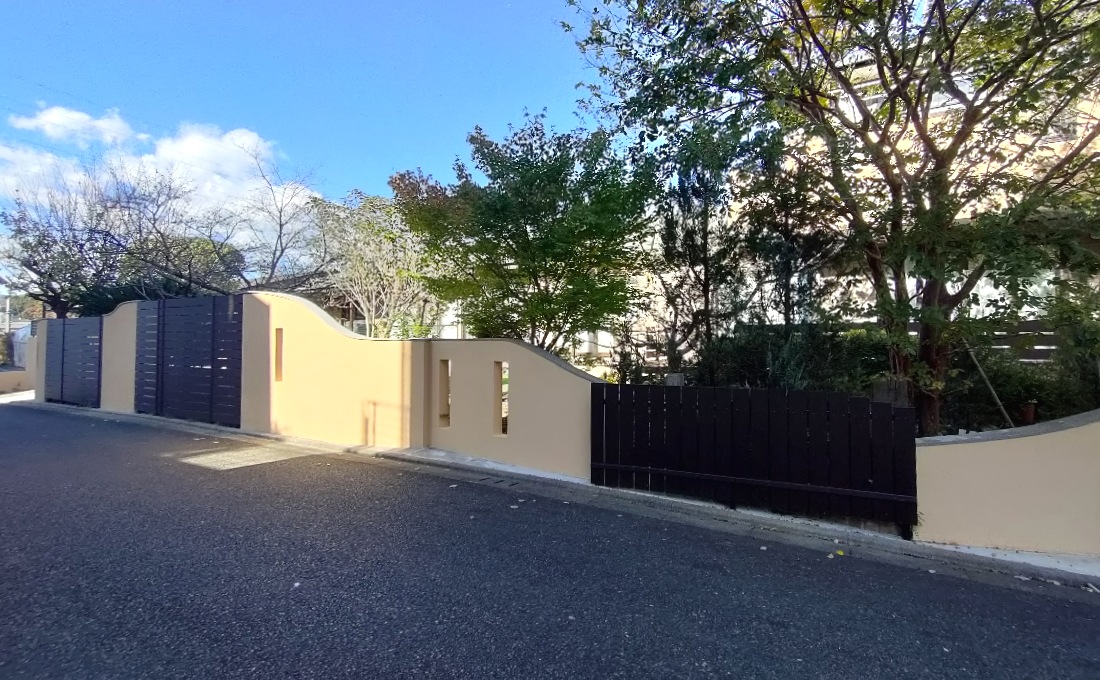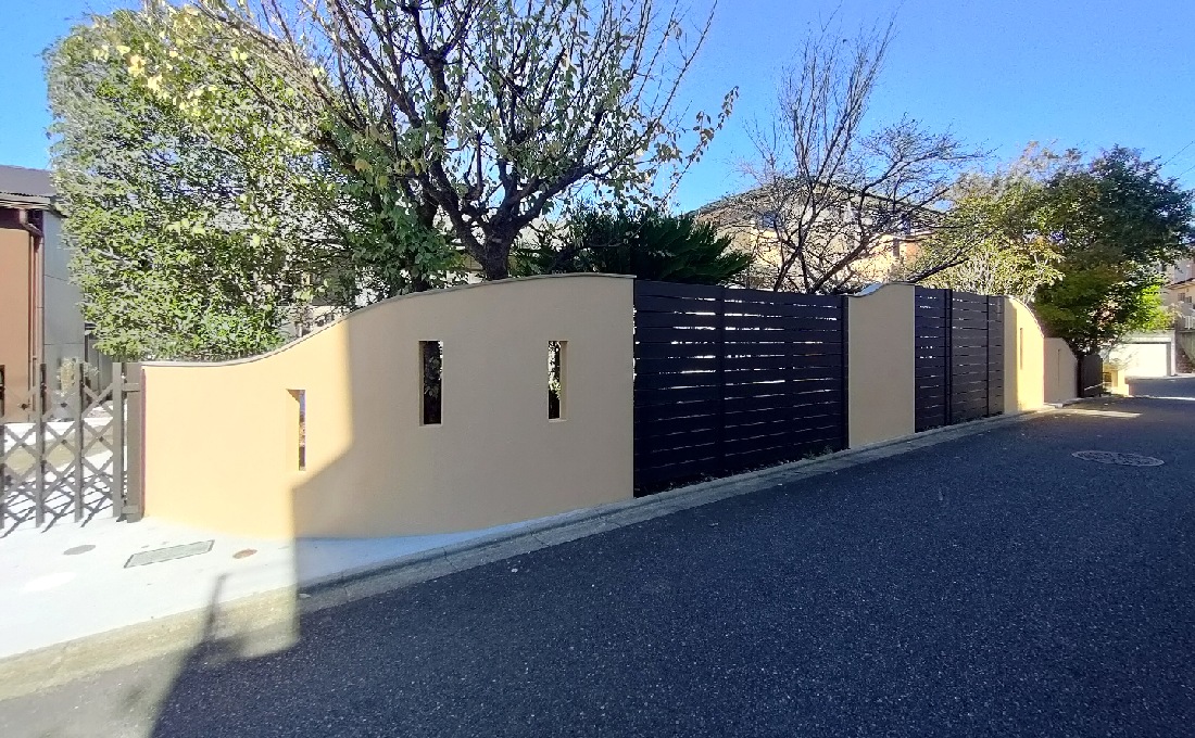 広いお庭と畑をお持ちのM様、道路との境界は生垣を撤去し、ウッド調フェンスやアールの塗壁を新設。