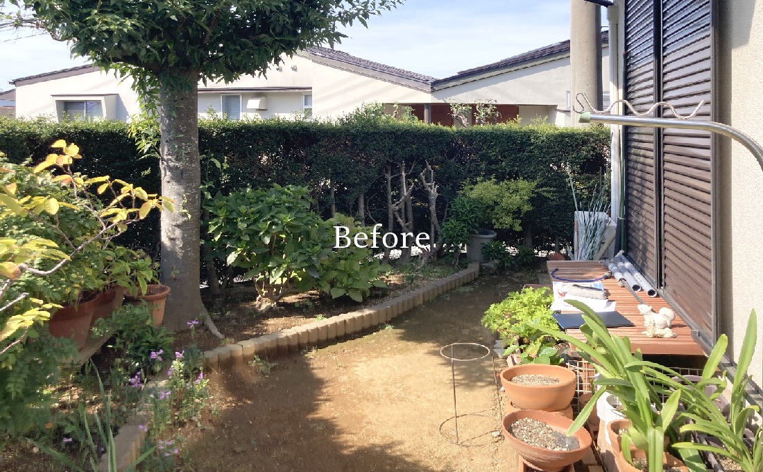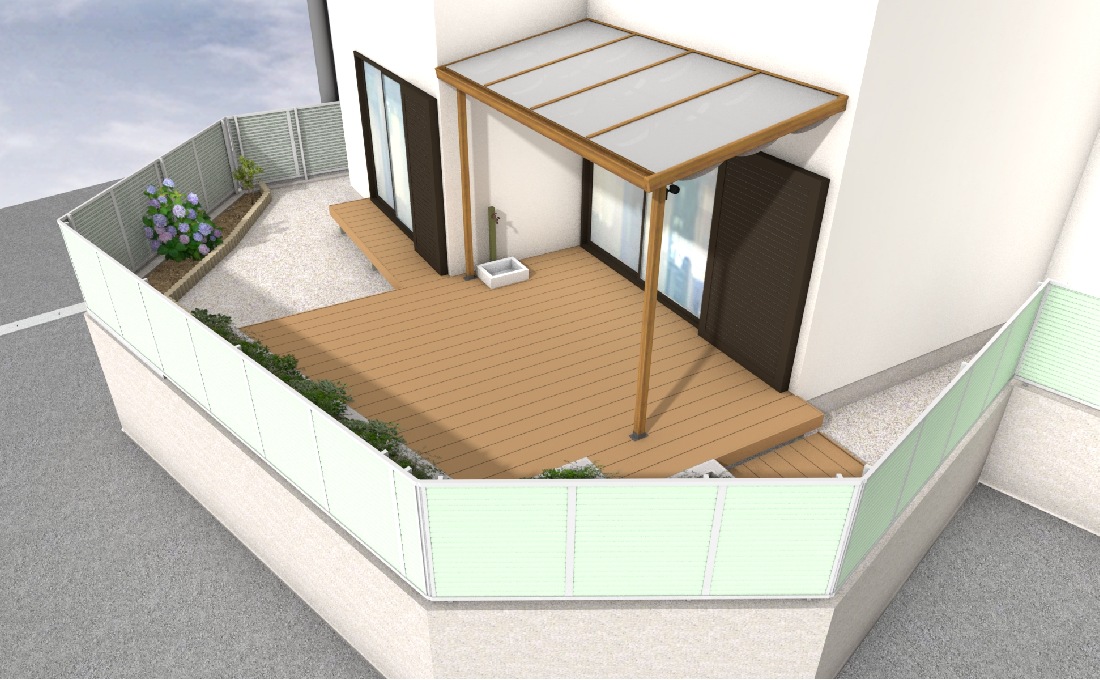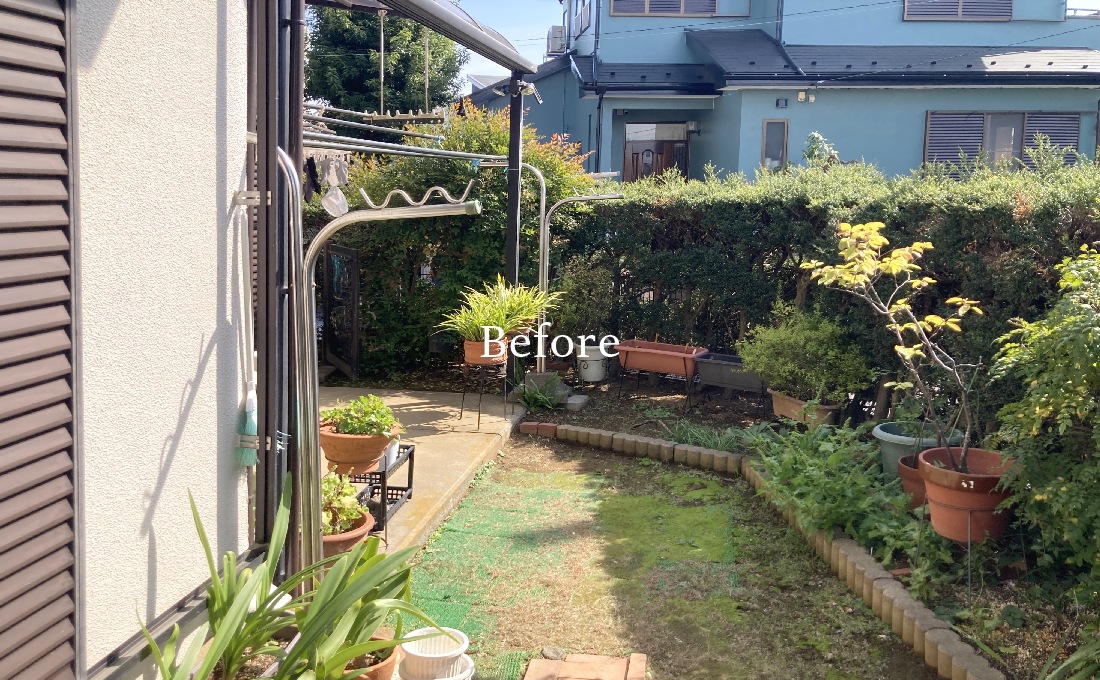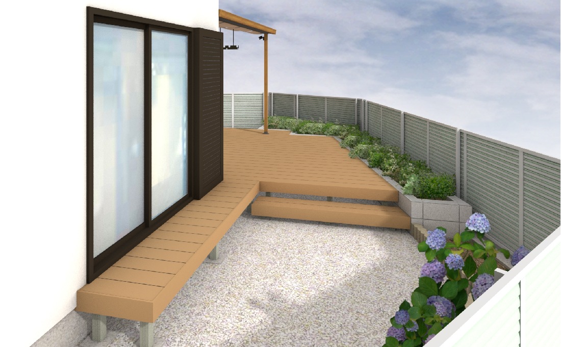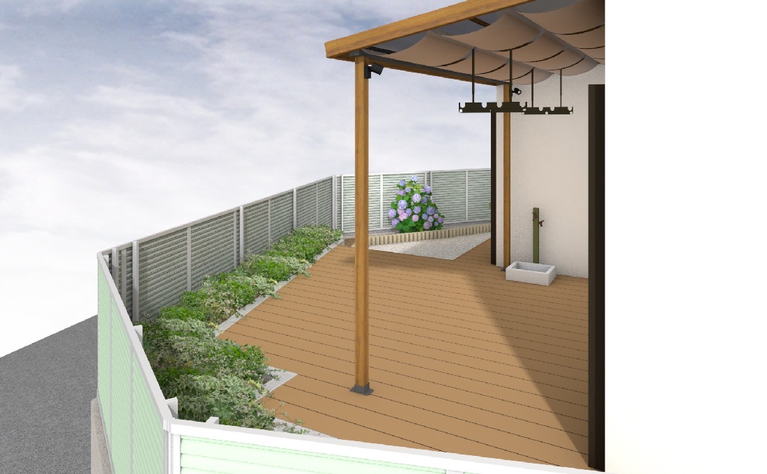 年々お手入れが大変になってきた広いお庭から、洗濯物を干せる屋根と広々としたウッドデッキへとリ・ガーデンしました。