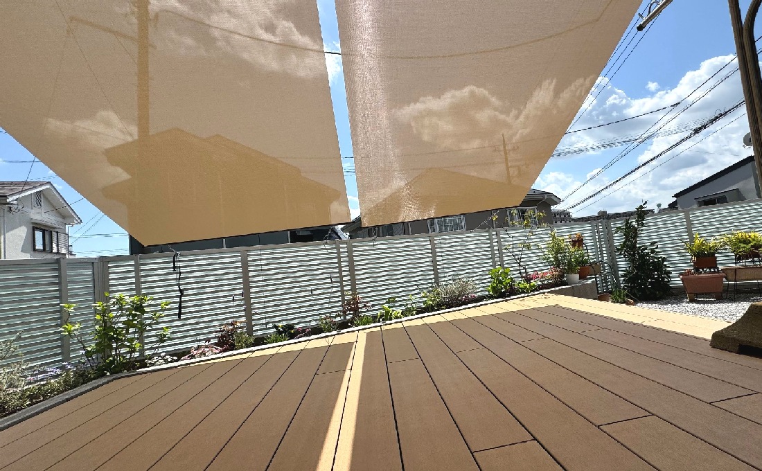 テラス屋根とスタイルシェードで日よけした広々ウッドデッキ