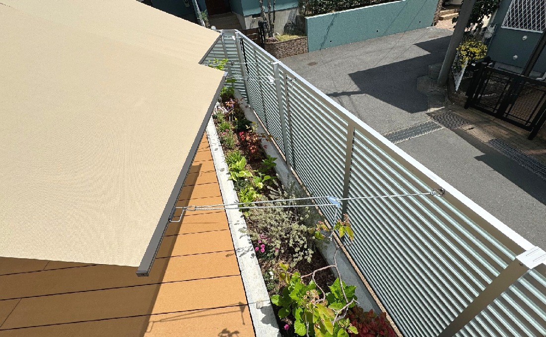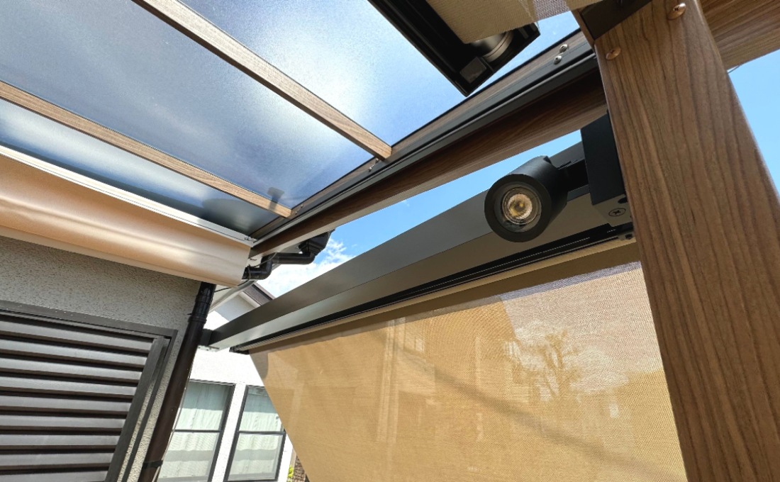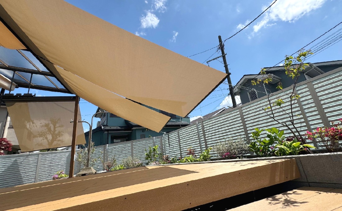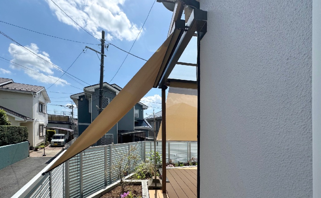 デッキの上で快適に過ごせるよう、テラス屋根に3枚の日よけ(LIXILスタイルシェード)を取り付けました。