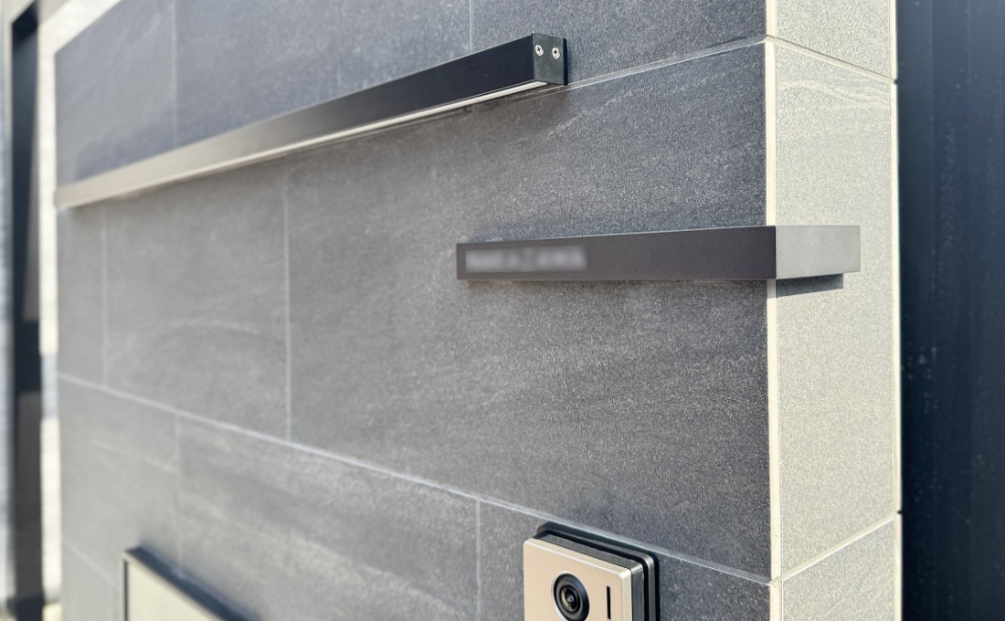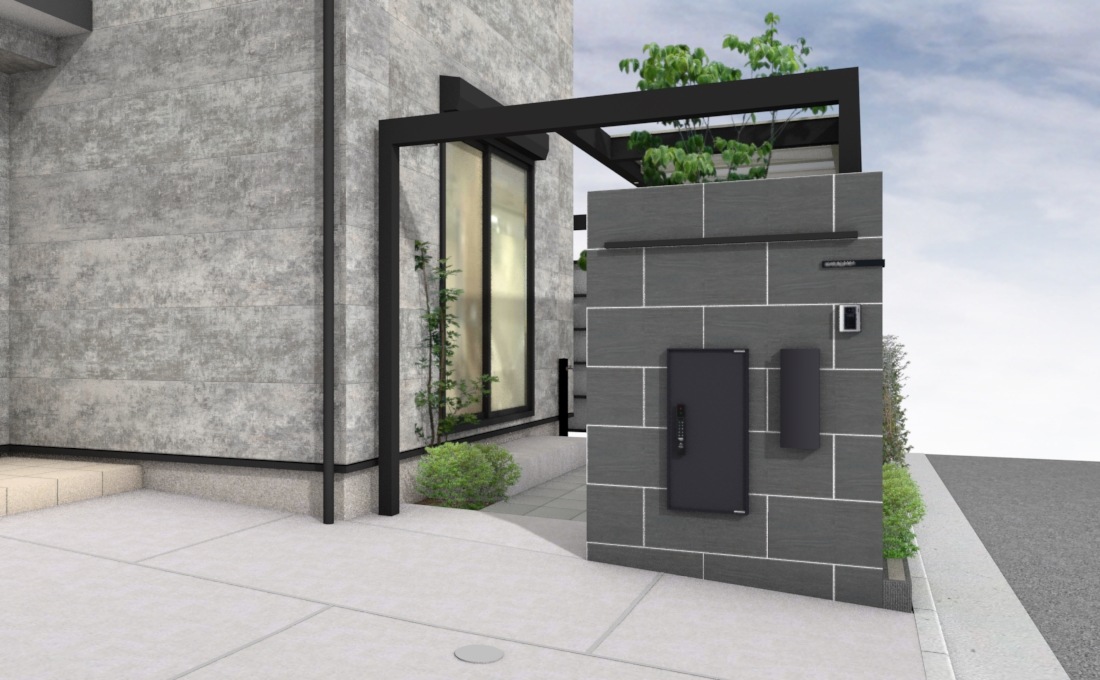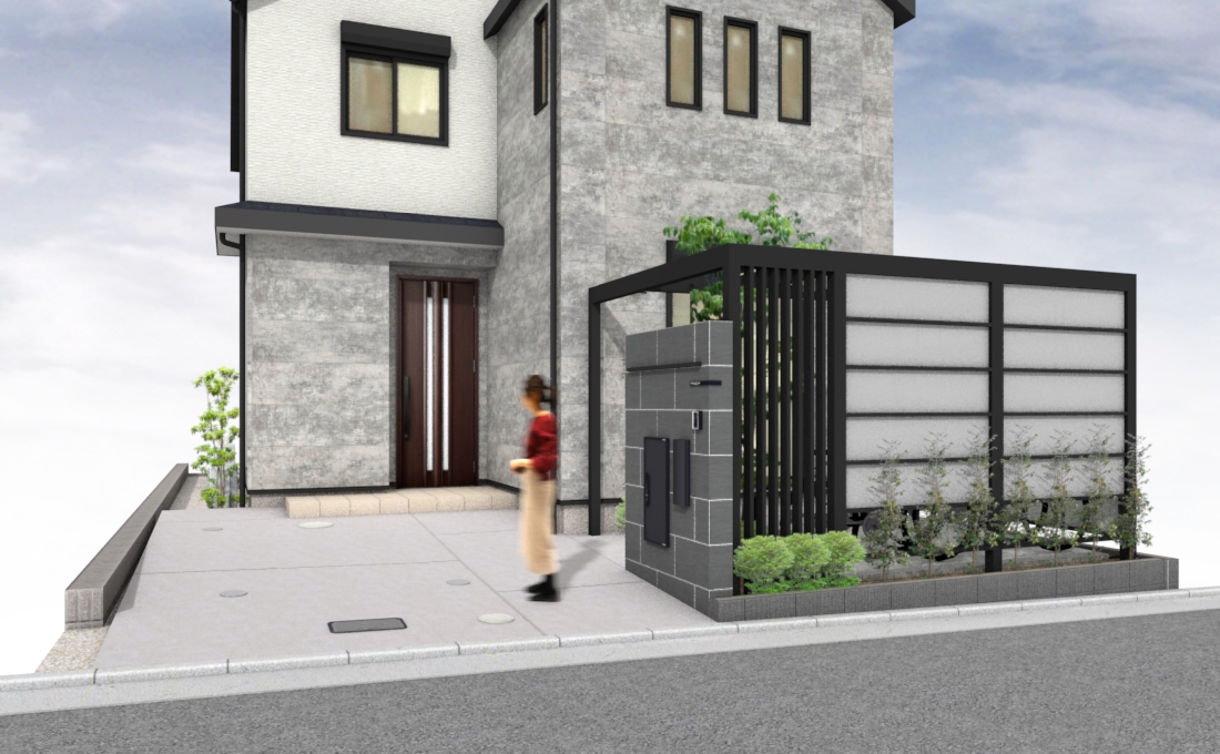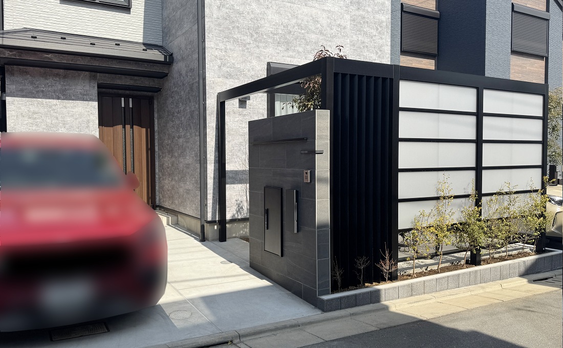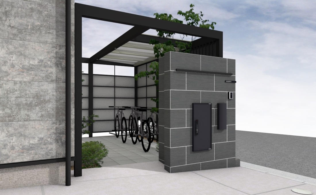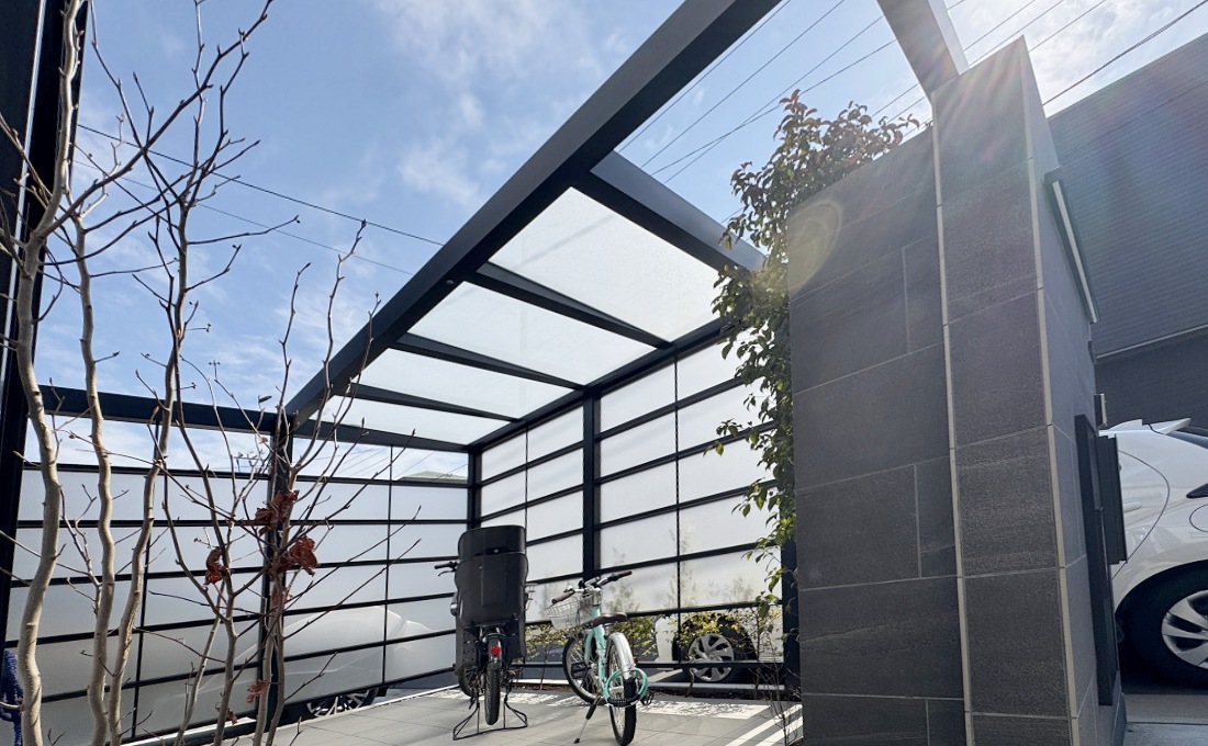 道路に面した窓の目隠しと、自転車置き場を兼ねたLIXILプラスG Gルーフフリータイプ。