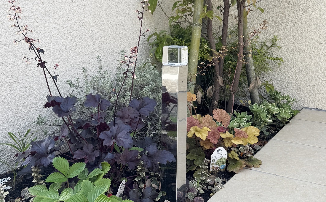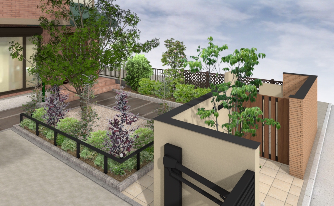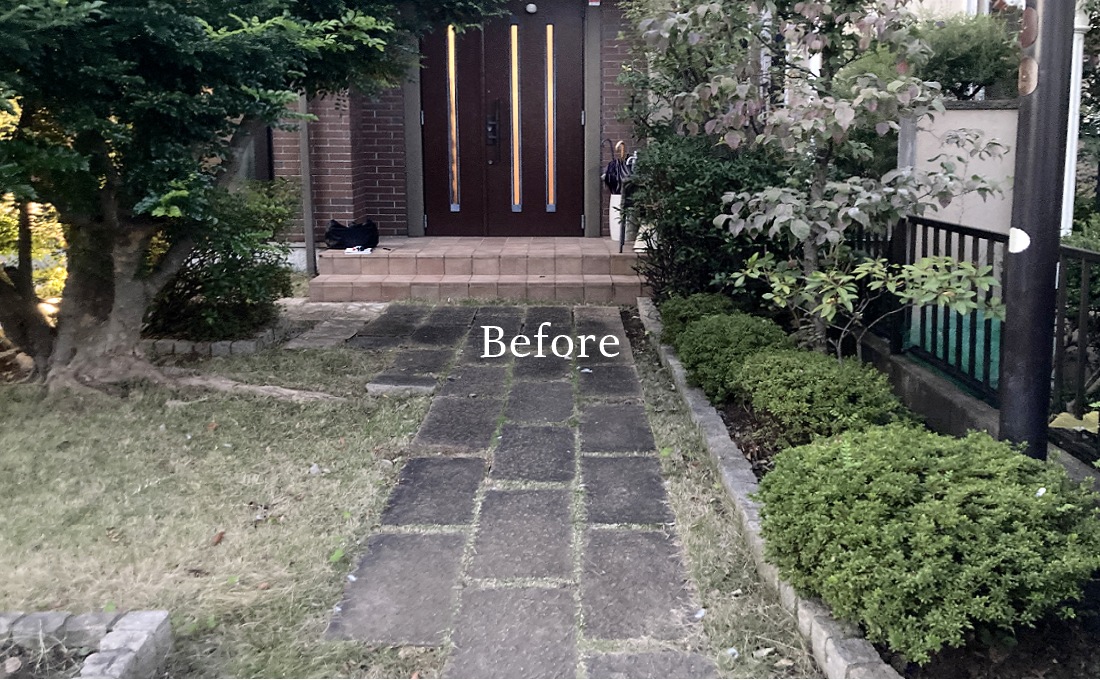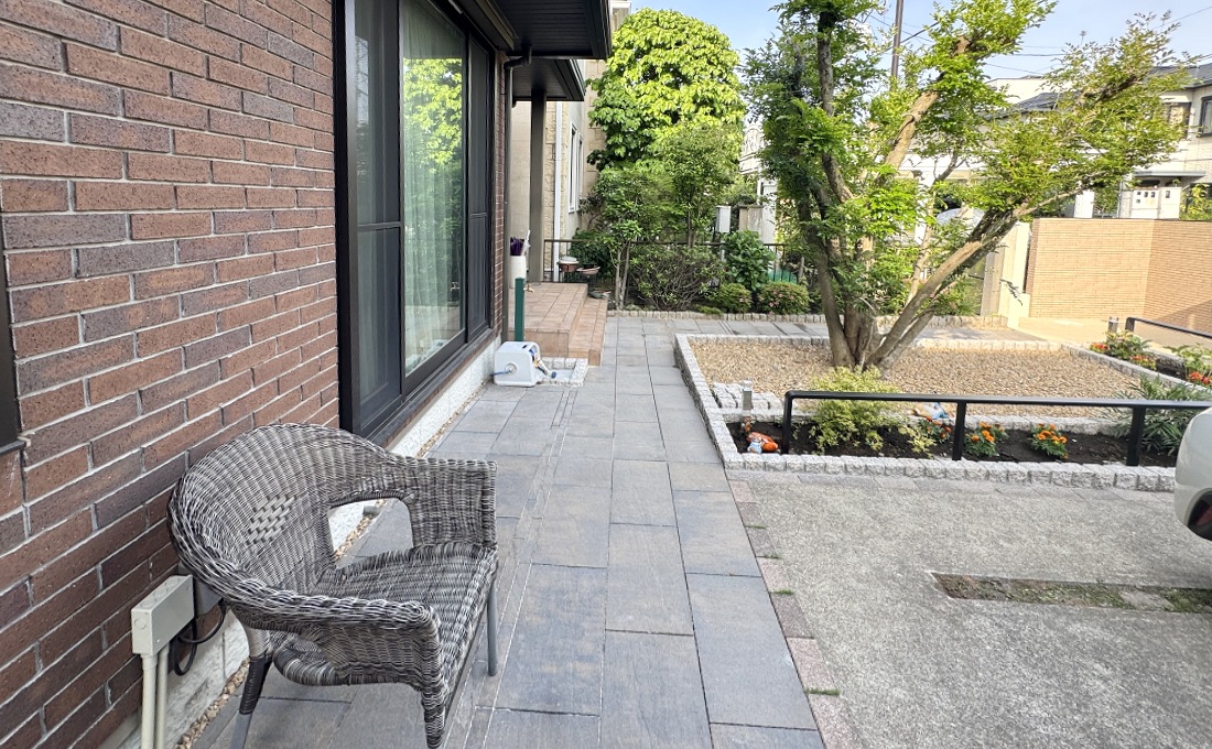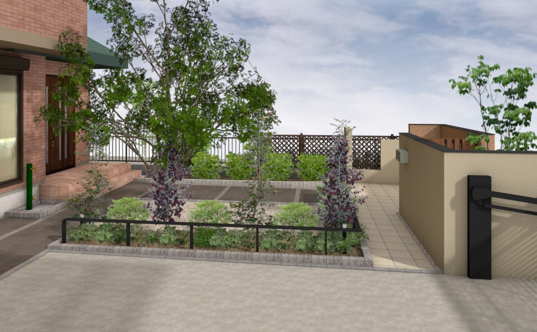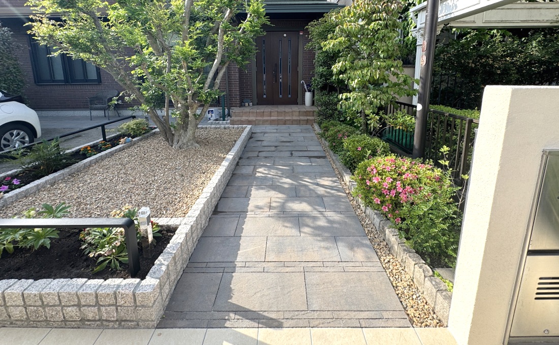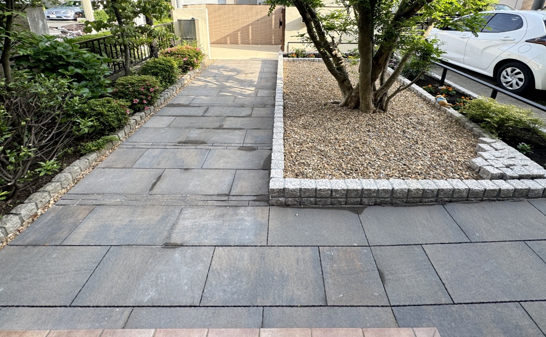 既存のシマトネリコのシンボルツリーは残し、植込みスペースの周囲をピンコロで区切りをつけ、お手入れしやすいように整備しました。