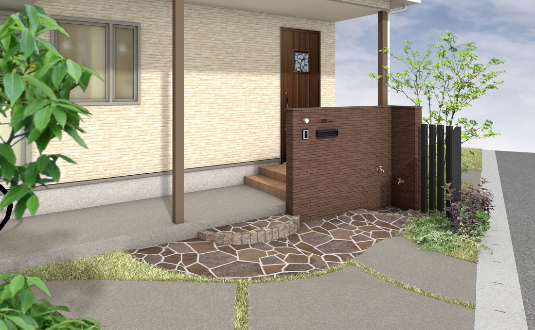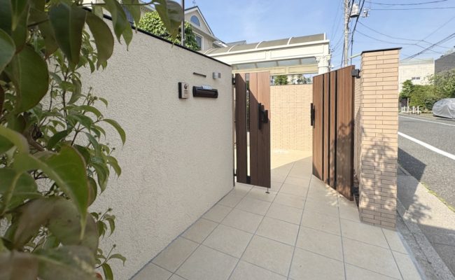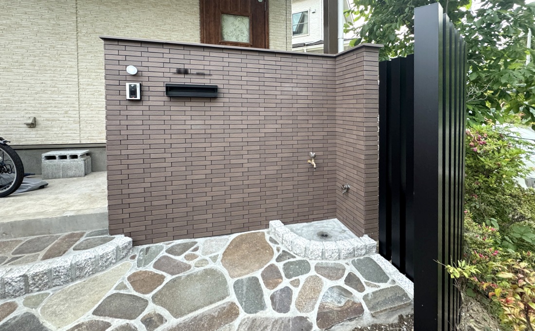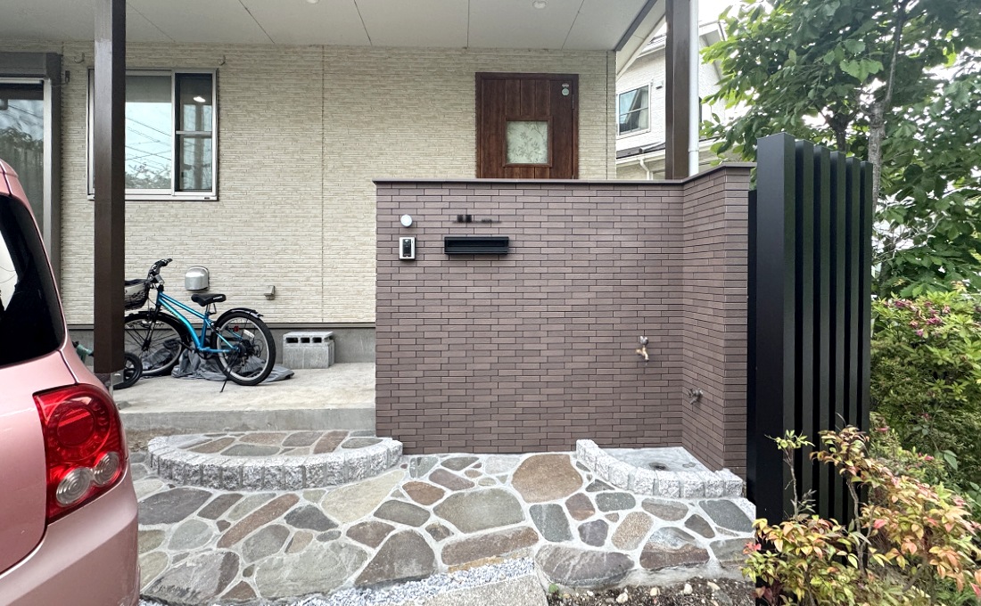 通りから玄関内部が見えにくくなるよう門袖壁を配し、水栓蛇口を埋め込んですっきりと一体化。
