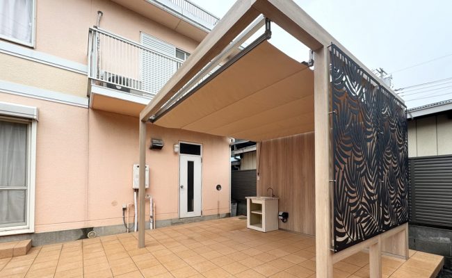 リビング・ダイニングからお庭を眺めた時に、隣家玄関が正面になるため、目線を隠しつつ光と風を十分に取り入れられるプライベート空間のご希望を頂きました。ここでは四季を感じる植栽とデッキでゆっくりと休日を過ごされたいとのご要望から、木のぬくもりを感じられるLIXILの『樹ら楽ステージ』と人工芝を提案。メンテナンスフリーの人工木材デッキと芝刈りのいらない人工芝により、そのぶん庭木の手入れを楽しむ時間にあてて頂けるプランとしました。