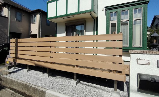 駐車スペースの後ろはリビングの延長でデッキスペースとなり、室内側からの景観に配慮してデッキ上に目隠しフェンスを設置しましたが、明るい色ですので圧迫感なく日中をお過ごしいただけるかと思います。